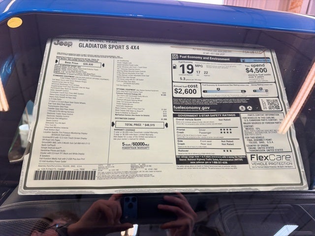 Features Include:, Gladiator Sport S, 4D Crew Cab, 3.6L V6 24V VVT, 8-Speed Automatic, 4WD, Hydro Blue Pearlcoat, Black Cloth, 110 Mph Vehicle Max Speed Calibration, 12.3 Touchscreen Display, 4G LTE Wi-Fi Hot Spot, Advanced Brake Assist, Air Conditioning, AM/FM radio: SiriusXM with 360L, Apple CarPlay/Android Auto, Automatic Headlamps, Black 3-Piece Hard Top, Deep Tint Sunscreen Windows, Electronic Stability Control, Freedom Panel Storage Bag, Front fog lights, Full Speed Forward Collision Warning Plus, Illuminated entry, Integrated roll-over protection, Mopar Black Tubular Side Steps, MOPAR Spray in Bedliner, Normal Duty Plus Suspension, Normal Duty Suspension, Occupant sensing airbag, ParkView Rear Back-Up Camera, Power Heated Mirrors, Premium Wrapped Steering Wheel, Quick Order Package 24S Sport S, Radio: Uconnect 5 with 12.3 Display, Rear Sliding Window, Rear Window Defroster, Remote keyless entry, Security Alarm, Steering wheel mounted audio controls, Sun Visors with Illuminated Vanity Mirrors, Telescoping steering wheel, Traction control, Variably intermittent wipers, Wheels: 17 x 7.5 Gray.