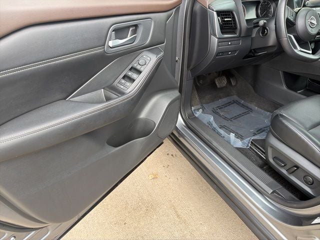 Featuring an impressive array of premium features, the 2023 Rogue SV is designed to exceed your expectations. Indulge in the comfort of heated driver and front passenger seats, a heated leather-wrapped steering wheel, and leatherette door trim inserts with stitching. Enjoy the convenience of a power liftgate, rear door sunshades, and rear personal lights, while the panoramic moonroof and silver-painted roof rails add a touch of elegance.